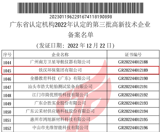 日前,中節(jié)能鐵漢環(huán)保集團有限公司(以下簡稱鐵漢環(huán)保)收到全國高新技術(shù)企業(yè)認(rèn)定管理工作領(lǐng)導(dǎo)小組辦公室發(fā)布的《關(guān)于對廣東省認(rèn)定機構(gòu)2022年認(rèn)定的第三批高新技術(shù)企業(yè)進行備案的公告》,根據(jù)《廣東省認(rèn)定機構(gòu)2022年認(rèn)定的第三批高新技術(shù)企業(yè)備案名單》,鐵漢環(huán)保已通過高新技術(shù)企業(yè)認(rèn)定。這是自2016年起,鐵漢環(huán)保連續(xù)第三次通過國家高新技術(shù)企業(yè)認(rèn)定。